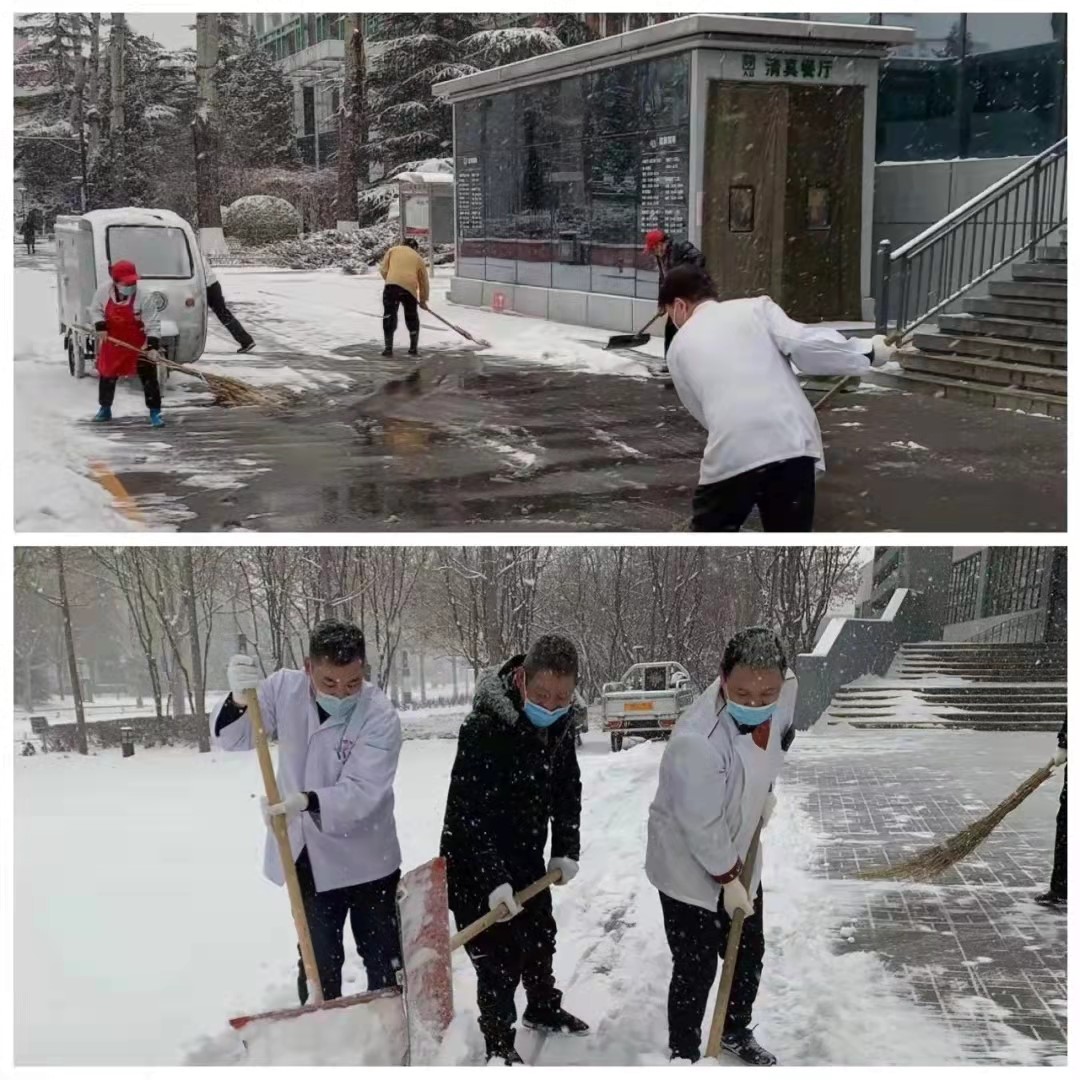 雪寒人心暖,天冷心不寒。大雪降临,食堂员工在工作之余及时响应、立即行动,及时清扫道路积雪,防止道路结冰,保障过往就餐师生安全。