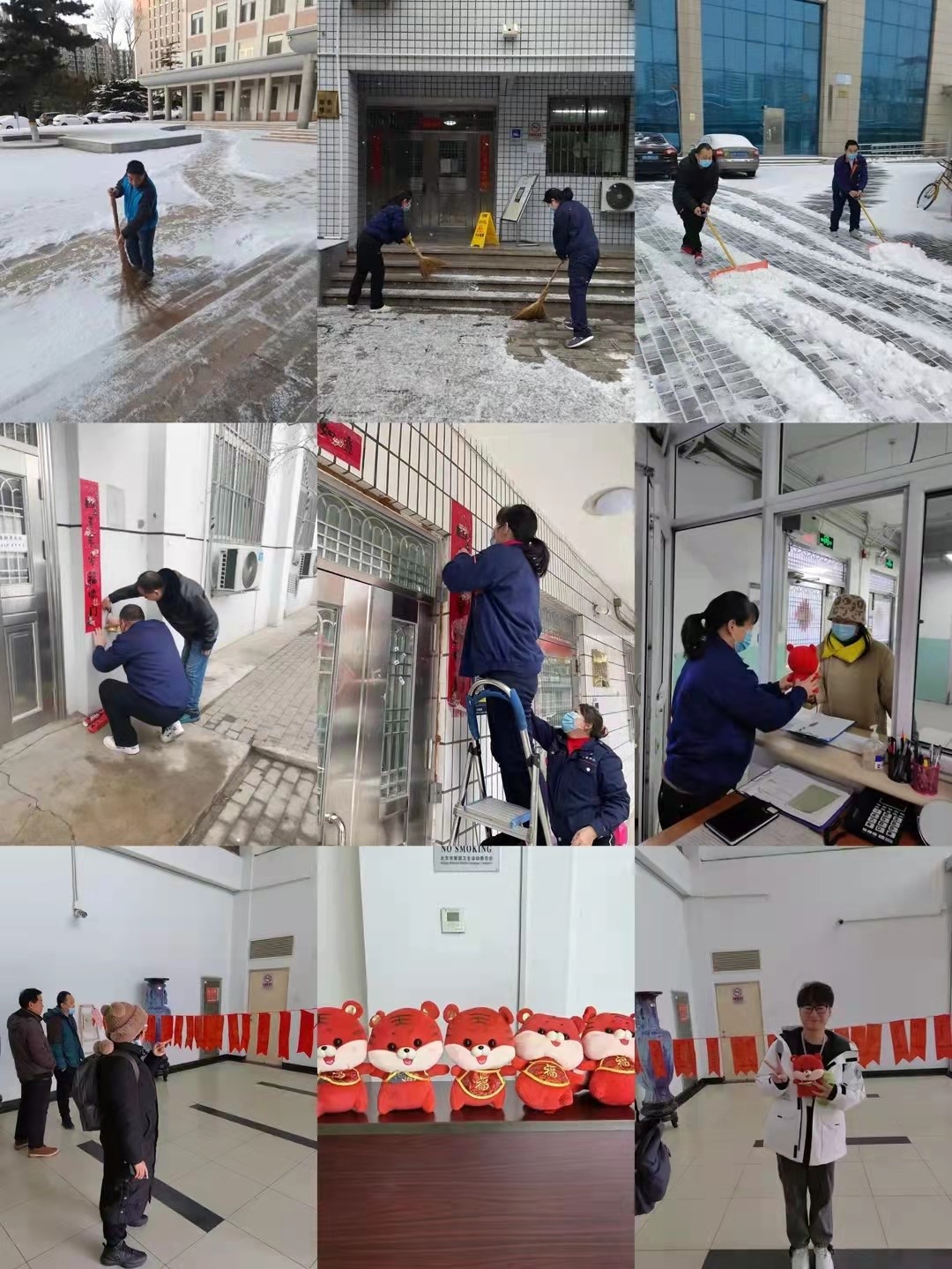 水电气暖稳定供应物业服务部员工强化寒假期间校内设施设备维修、浴室消毒管理、扫雪防滑等工作,做到井然有序、水电暖正常运转;新春将至,物业服务部负责为全校悬挂节庆灯笼,营造浓厚的“年味儿校园” 节日氛围。