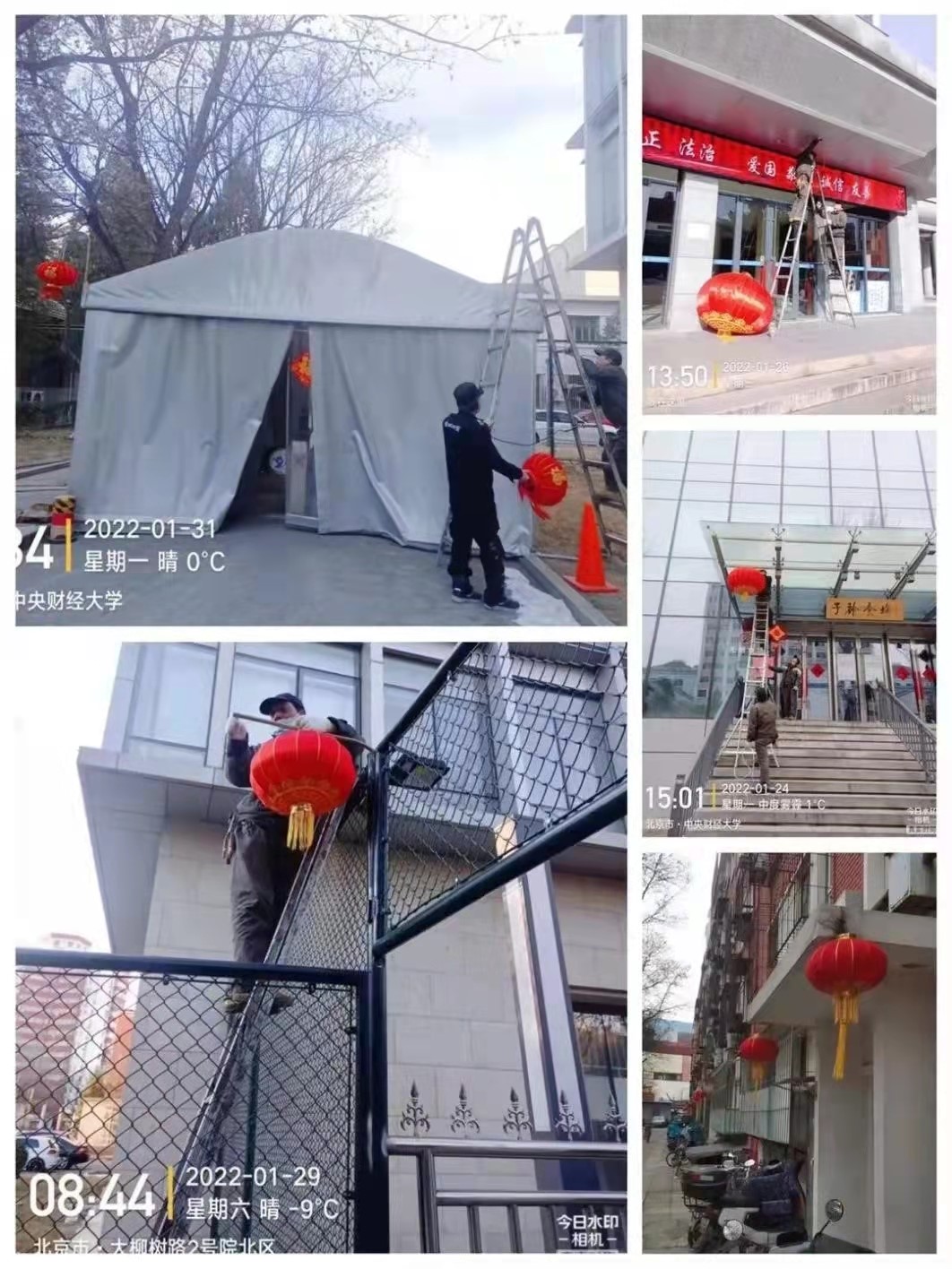 清河、西山两校区紧绷疫情防控、火灾隐患安全弦,有秩序、分批次组织开展火灾隐患集中整治排查活动,筑牢校园消防安全“防火墙”。清河物业部加强快递柜的管控消毒,有条不紊地做好学一楼学生离校登记、楼宇保洁消杀管理工作;春节前夕,在校门口、家属楼、教职工公寓等地布置灯笼、张贴福气春联,为校园增添欢乐祥和的节日气氛。